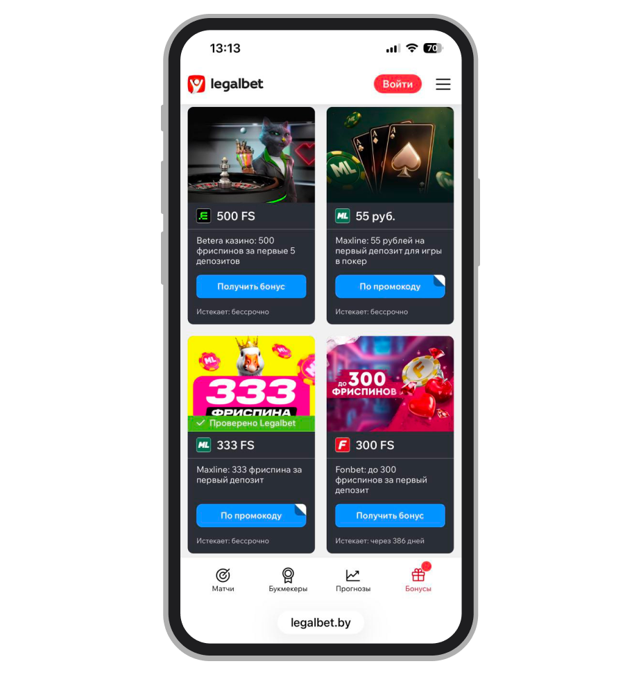 Легальных казино, предлагающих бездепозитный бонус за регистрацию в Беларуси в 2025 году нет. По законодательству Республики Беларусь операторам запрещено начислять бонусы клиентам, не имеющим денежных средств на счёте. Мы предлагаем рассмотреть актуальные бонусы онлайн-казино с лицензией, которые соблюдают законодательство РБ.