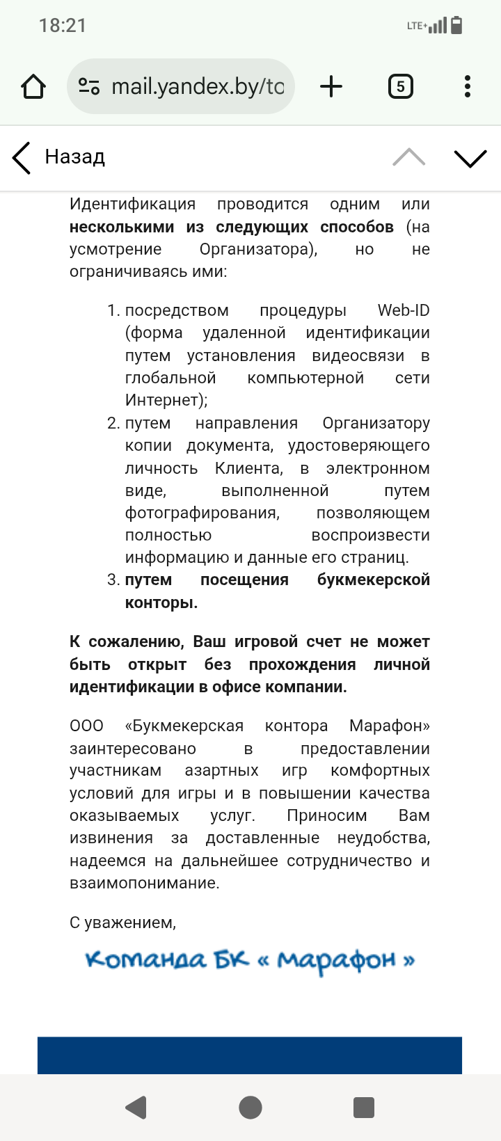 Вот они пишет верификация одним или несколькими способами,я прошел 1 и 2 пункт верифа,3-й пункт посещение букмекерской,но так как у них нет ни одной букмекерской,то надо посещать офис,это же нарушение своих правил,т.к. если была бы букмекерская хотя бы одна,она бы работала каждый день с утра до вечера,а они зовут в офис в котором принимают только по пятницам с 11 до 15,почему я должен подстраиваться в 4 часа в неделю,что они работают,как людям с других городов ездить?