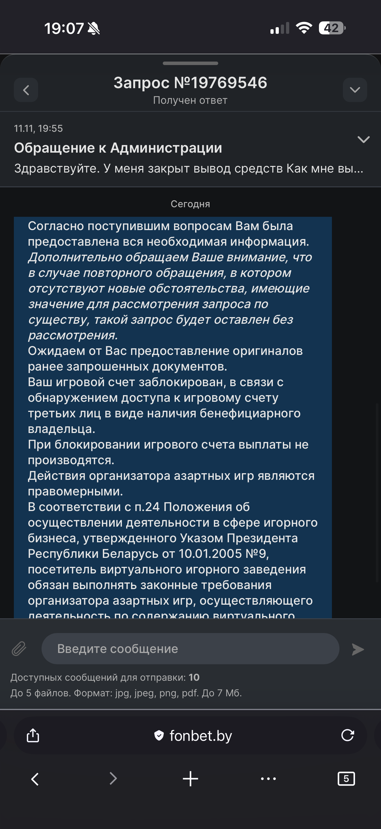 Дмитрий, обращаю ваше внимание, что данная жалоба является повторной вы мне и на первую не ответили это уже более свежая и ответа от администрации сайтов fonbet я не получаю больше в принципе они меня игнорируют!