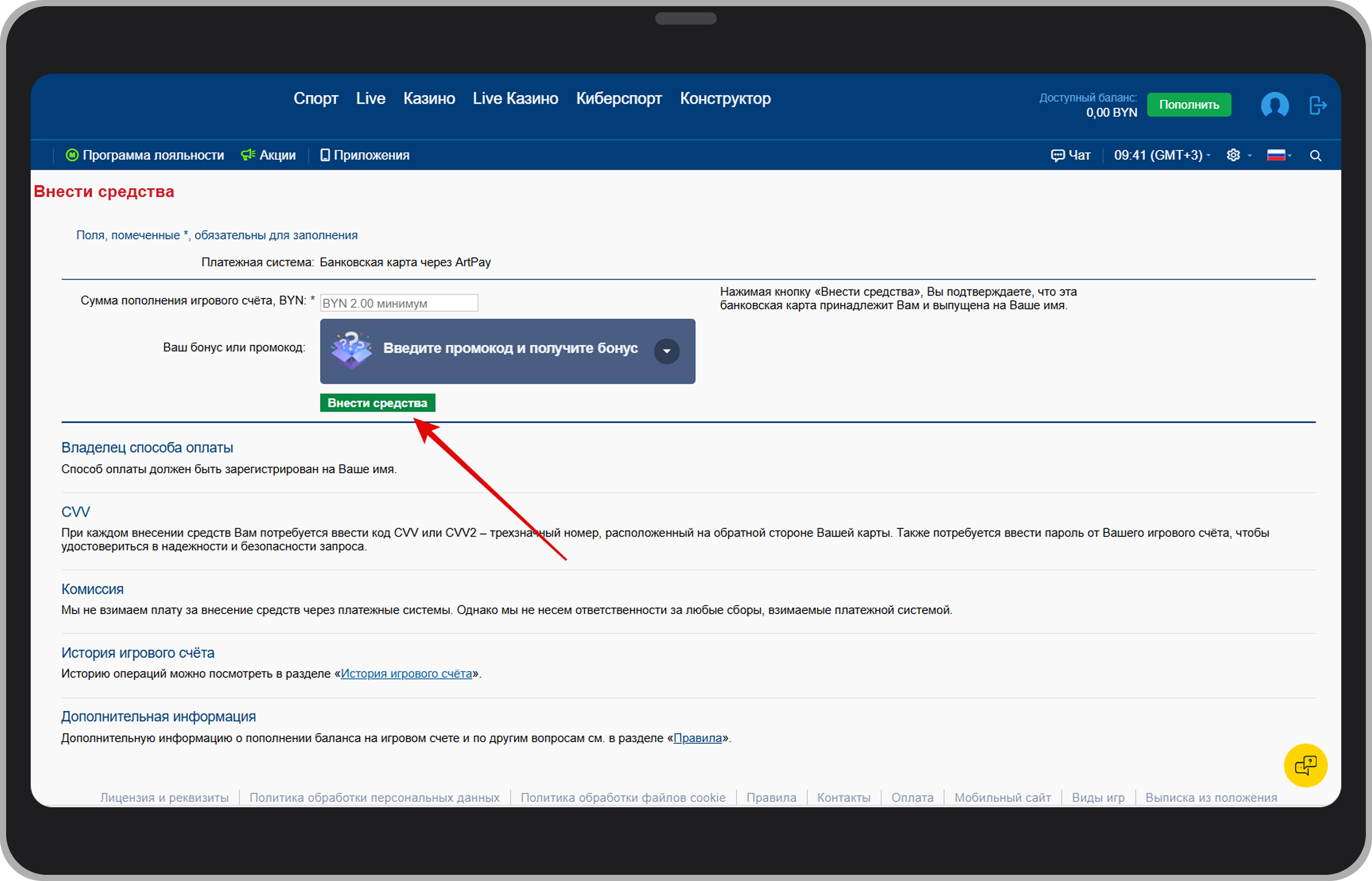Следом за указанием суммы пополнения и нажатия иконки «Внести средства» вы будете перенаправлены на сайт платёжной системы ArtPay. Здесь следует указать требуемые данные банковской карты и осуществить платёж. Деньги на игровой счёт БК «Марафонбет» поступят в течение 15 минут, но чаще всего зачисление происходит моментально.