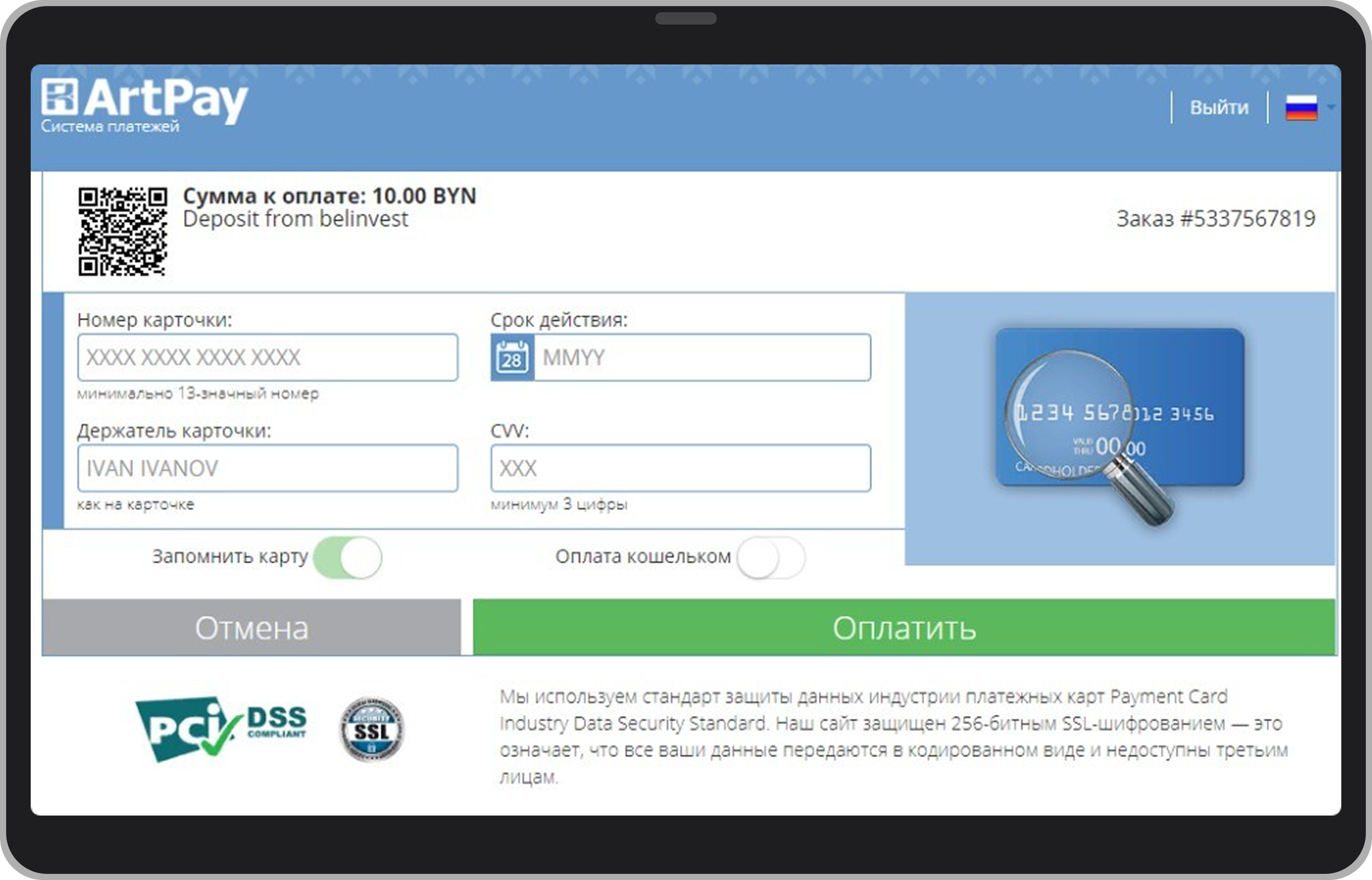банковской картой (Visa, MasterCard, Maestro и Белкарт) через систему платежей ArtPay;