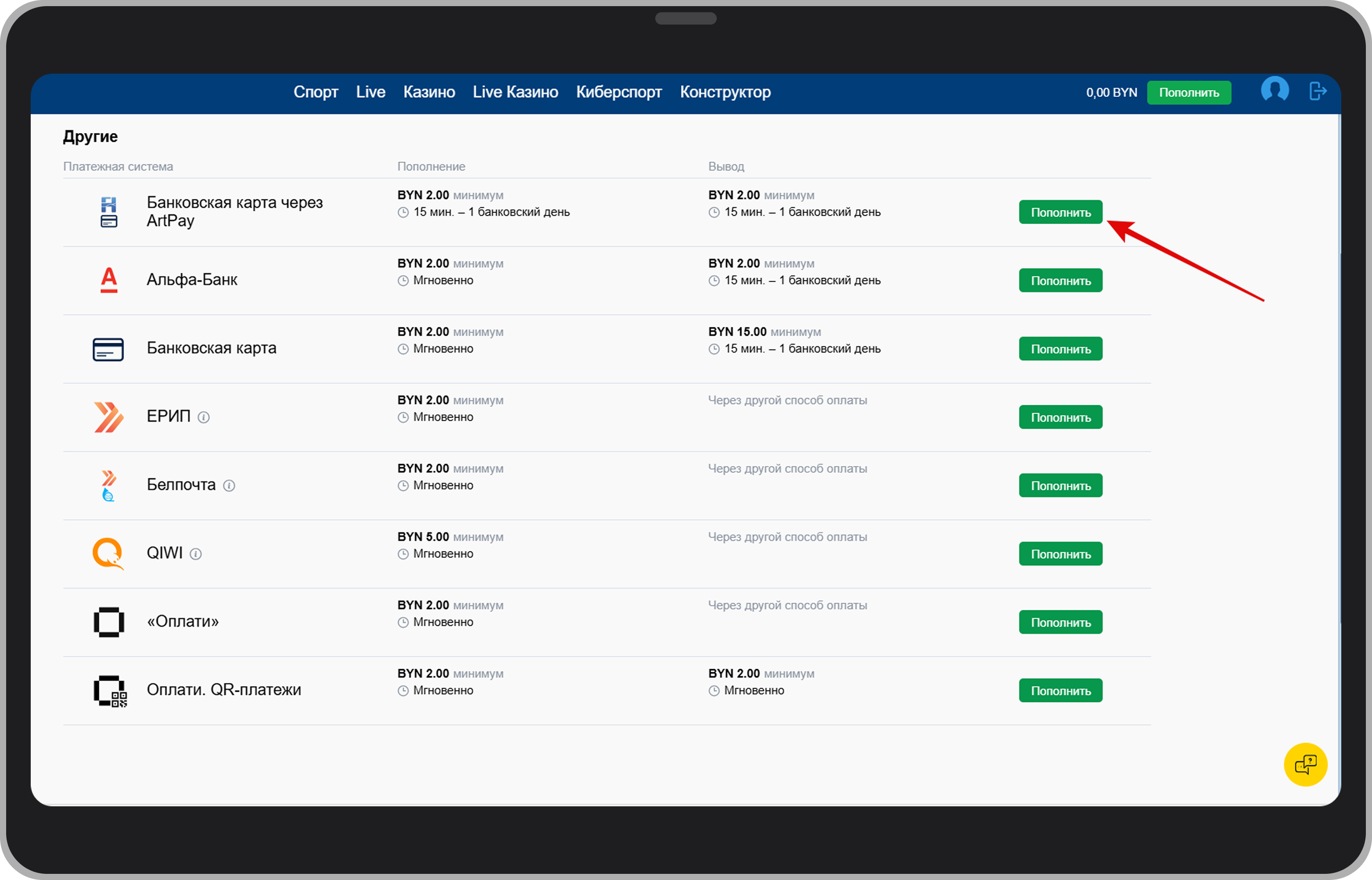 Внести деньги на игровой счёт в Мarathon можно с помощью платёжной системы ЕРИП. Осуществить платежи предлагается: