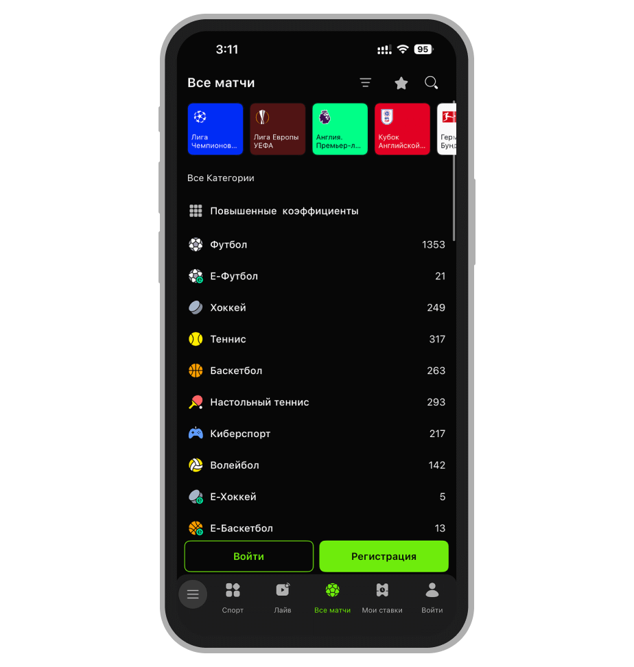 Совершать ставки в приложении букмекерской конторы Betera можно лишь после внесения депозита. Как только счёт в «Бетера» пополнен, перейдите в разделы «Прематч» или «LIVE», чтобы выбрать событие для ставки.